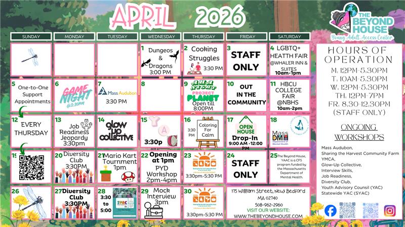 The Beyond House, Young Adult Access Center is a drop-in center for 16-26-year-olds that is a low barrier (free, no referral or insurance needed) youth-driven safe space that supports young adults’ transition into adulthood, be a bridge for mental health and substance misuse services, community resources, encourage social connectedness, leadership opportunities, and fostering healthy family relationships.